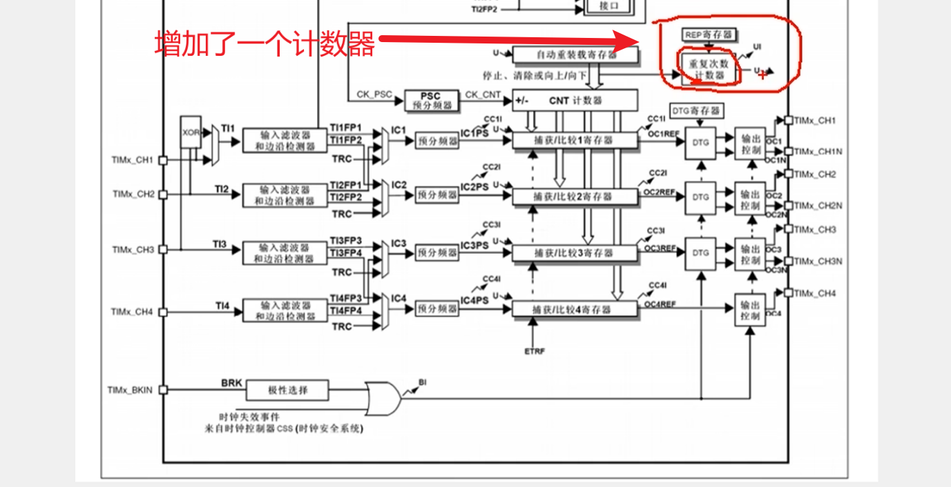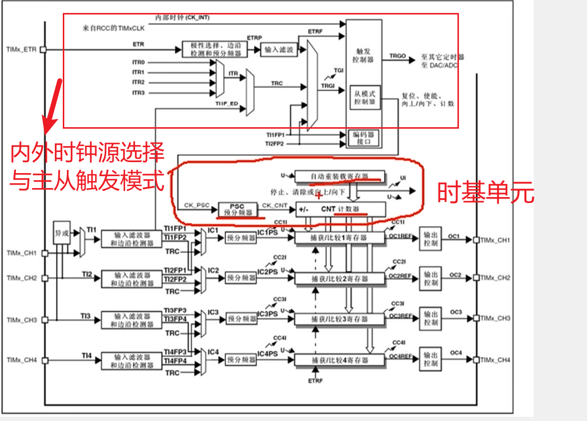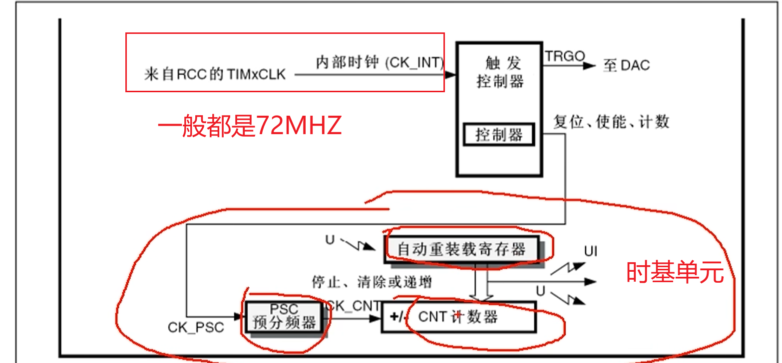 - 自动重装寄存器:存你设置的 "目标计数值",计数到这个值就触发中断,同时计数器会自动清零、重新开始计数(自动重装)。