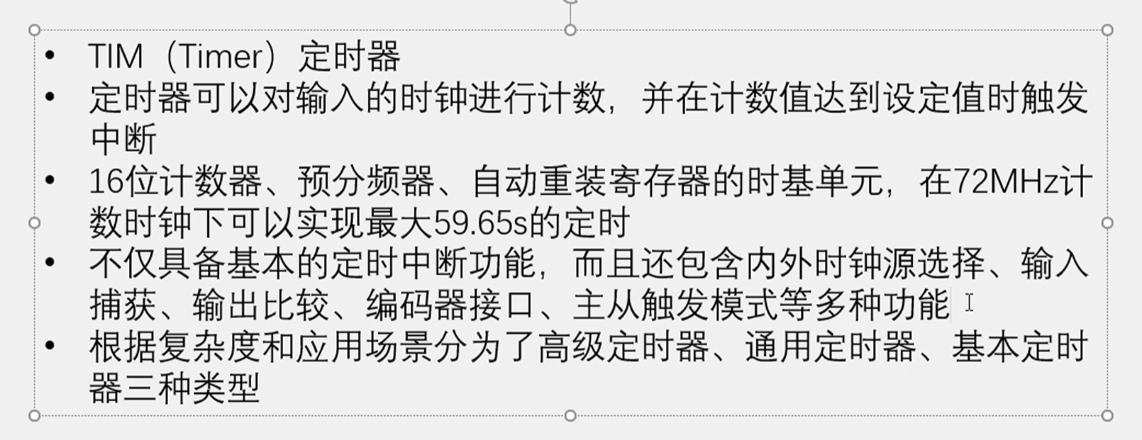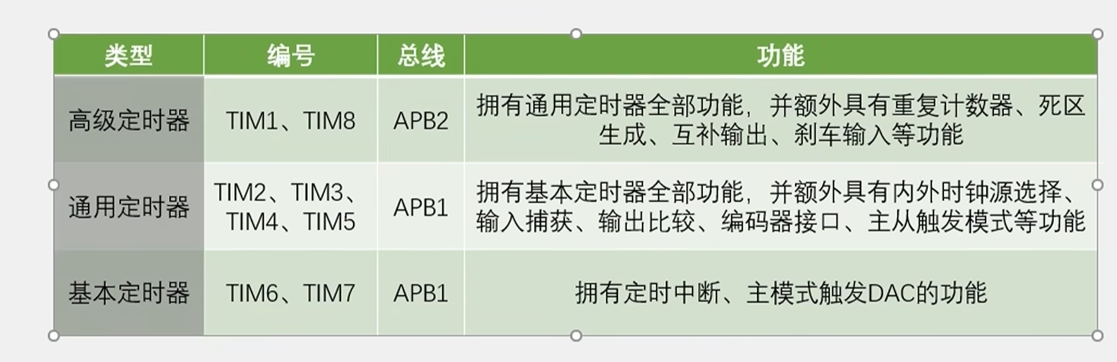 - 通用定时器:支持定时、输入捕获、输出比较、编码器接口等(比如 TIM2-TIM5);