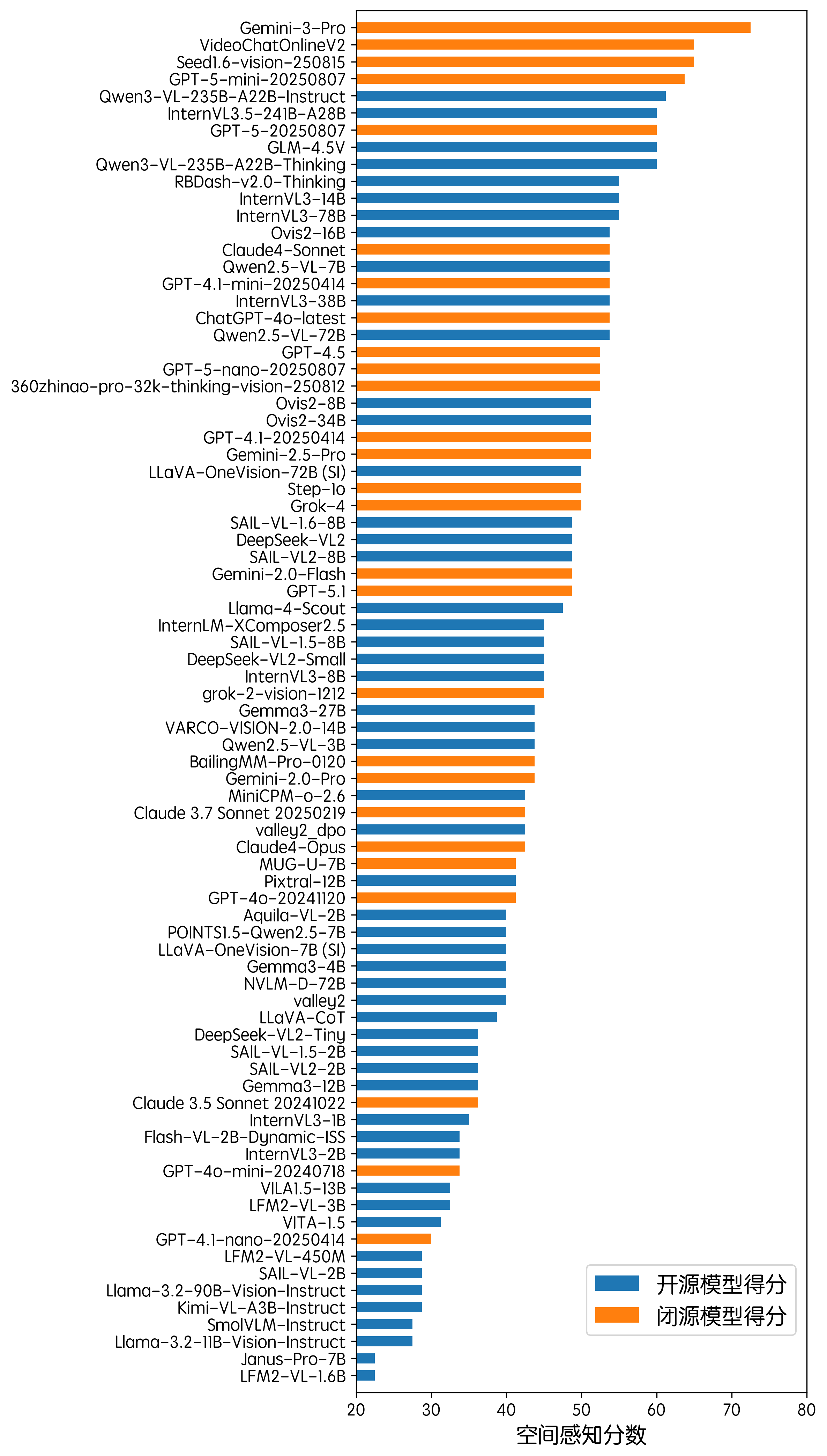 在空间感知方面,很多新模型都获得了较大幅度的提升。最为亮眼的当属 Gemini-3-Pro,在此能力上大幅领先其他模型,展现了 Gemini 在世界知识上的强大能力。同样亮眼的是新上榜的 VideoChatOnlineV2,获得了与 Seed1.6-vision-250815 并列第一的好成绩。