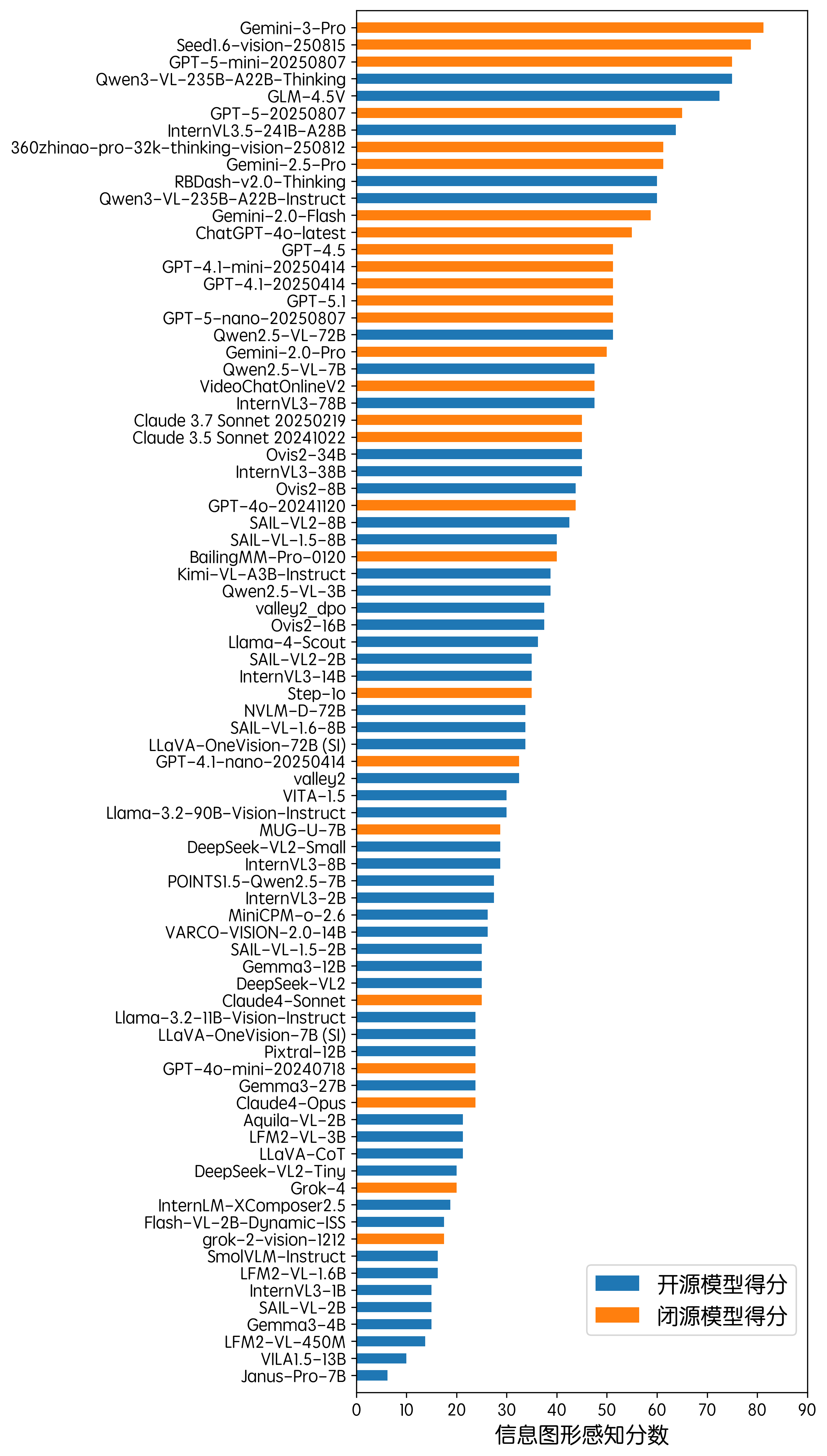 在信息图形感知方面,同样是 Gemini-3-Pro 取得了排名第一的成绩,但分差并没有领先第二名的 Seed1.6 太多。开源模型则相较上期榜单在这一方面有一定性能提升,Qwen3-VL-235B-A22B-Thinking 追平了 GPT-5-mini-20250807,另外一个新上榜的模型 RBDash-v2.0-Thinking 以 38B 的参数量同样跻身前十名的行列,期待开源模型能够在后续取得更好的成绩。
