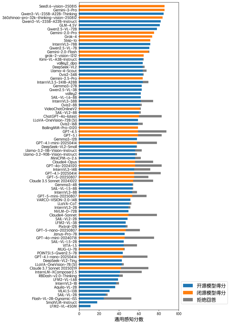 在通用感知能力方面,闭源模型 Seed1.6-vision-250815 与 Gemini-3-Pro 并列第一。在通用感知测试中存在涉及人物识别的问题,其中 GPT 模型在此问题上现象比较严重,一定程度上影响了得分情况。下方的性能展示图片标注了每个模型的拒答比率。