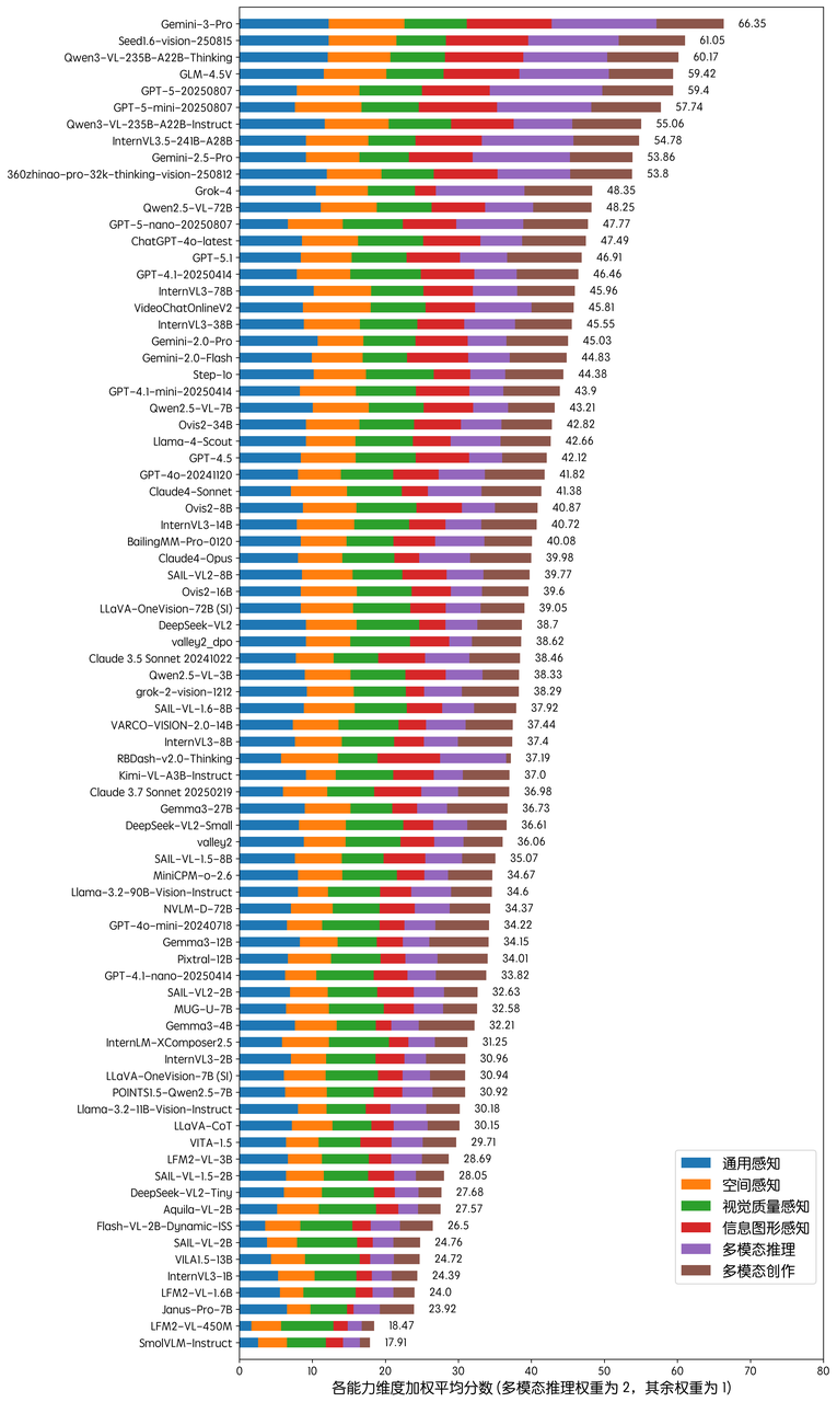 在整体性能上,Gemini-3-Pro 在空间感知能力上的大幅度领先以及在信息图形感知能力上的优势,助力其以大比分领先第二名的 Seed1.6-vision-250815,而其在视觉质量感知和多模态创作领域虽仍居于前列,但仍无法达到全方面领先。