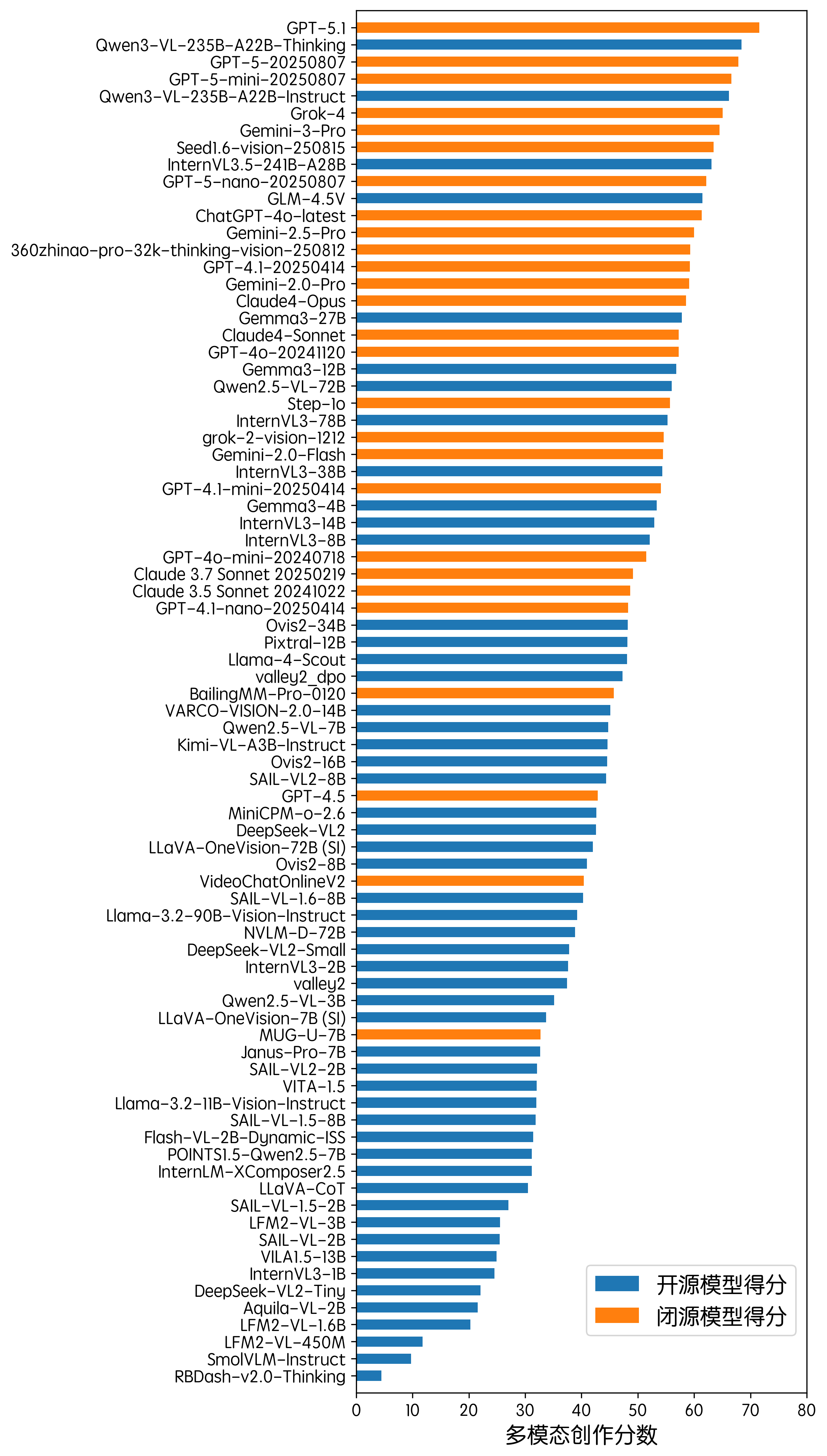 在其他本次新上榜的模型中,OpenAI 的 GPT-5.1 在综合能力上有所下降,但在多模态创作领域却能斩获最高分,印证了 OpenAI 对 GPT-5.1 的 "更具对话感、更加温暖" 的宣传。Qwen3-VL-235B-A22B-Thinking 则再次成为最强开源多模态模型。