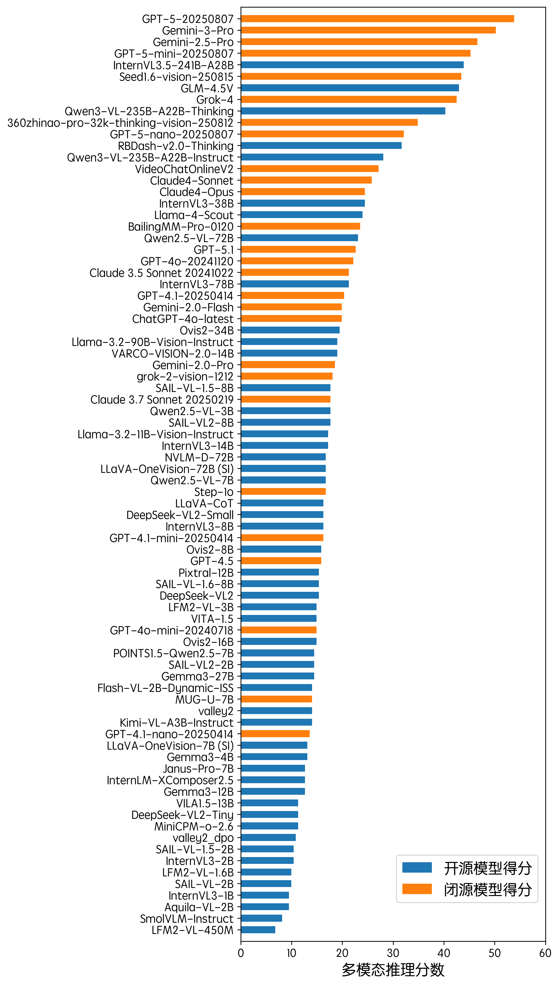 在多模态推理方面,GPT-5-20250807 在评测中维持了第一名的成绩,而 Gemini-3-Pro 则超越了前代 Gemini-2.5-Pro,成为了新的第二名。总体而言,闭源模型在推理能力方面占据较强的统治地位,开源模型仍在持续追赶中,Qwen3-VL-235B-A22B-Thinking 跻身前十,而开源模型中的第一名依然是 InternVL3.5-241B-A28B。