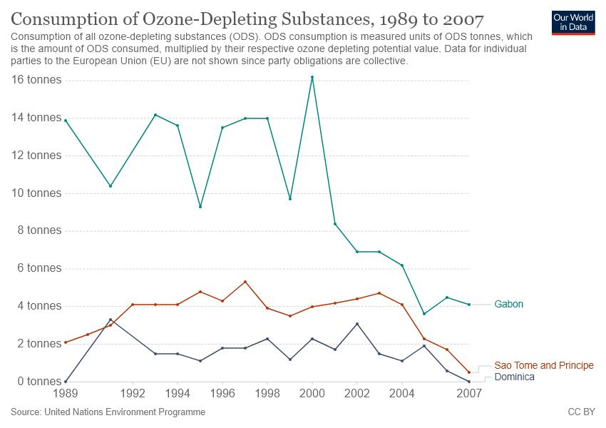 只有在哪一年Sao Tome and Principe的臭氧物质消耗量低于Dominica?