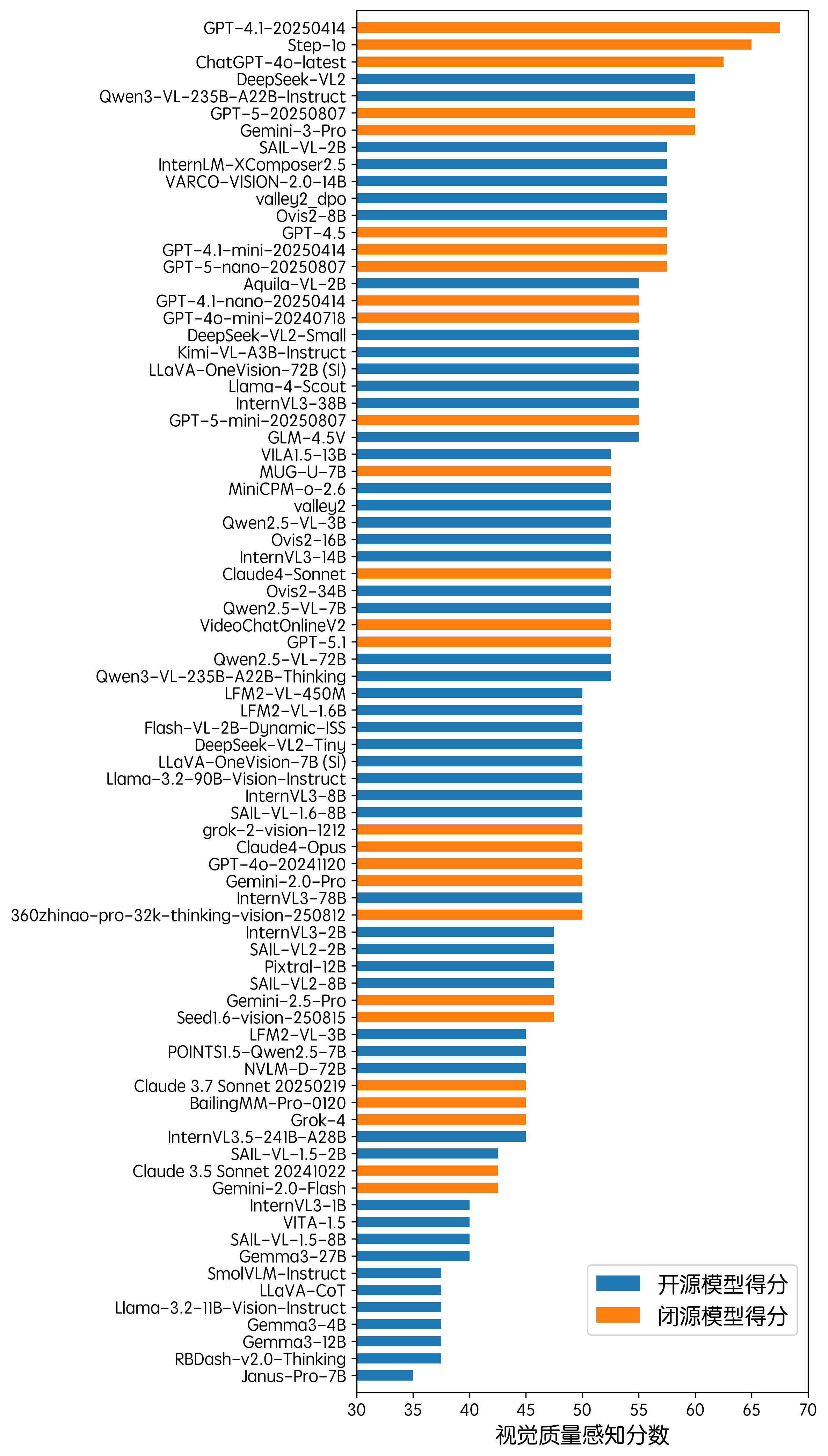 在视觉质量感知方面,在前 5 名中 Qwen3-VL-235B-A22B-Instruct 为本次榜单新近上榜,此类任务涉及对图像缺陷的判断,这一特殊的任务类型,使很多综合实力很强的模型得分不高,而一些小模型,如 SAIL-VL-2B、OVis2-8B 反而获得了较高的得分。