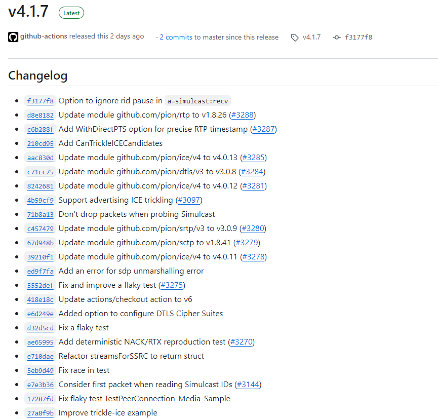 pion/webrtc v4.1.7 在多媒体传输稳定性和协议兼容性上有显著提升,尤其是 Simulcast 优化、ICE trickling 支持、精准 RTP 时间戳以及可配置 DTLS 密码套件,为开发者提供了更多控制和优化的可能性。同时,此次更新同步维护了依赖库版本,保障了整体系统的安全与性能。