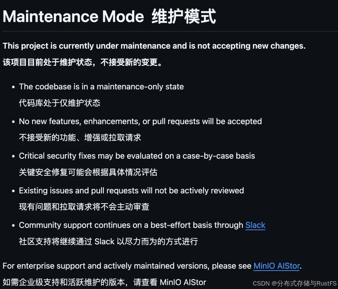 近日,开源对象存储领域发生重要变化:MinIO官方正式宣布其开源版本进入"维护模式"。这一变化意味着该项目将不再增加新功能,仅提供有限的安全更新和关键Bug修复,同时积极引导用户转向其商业产品MinIO AIStor(起价约9.6万美元/年)。