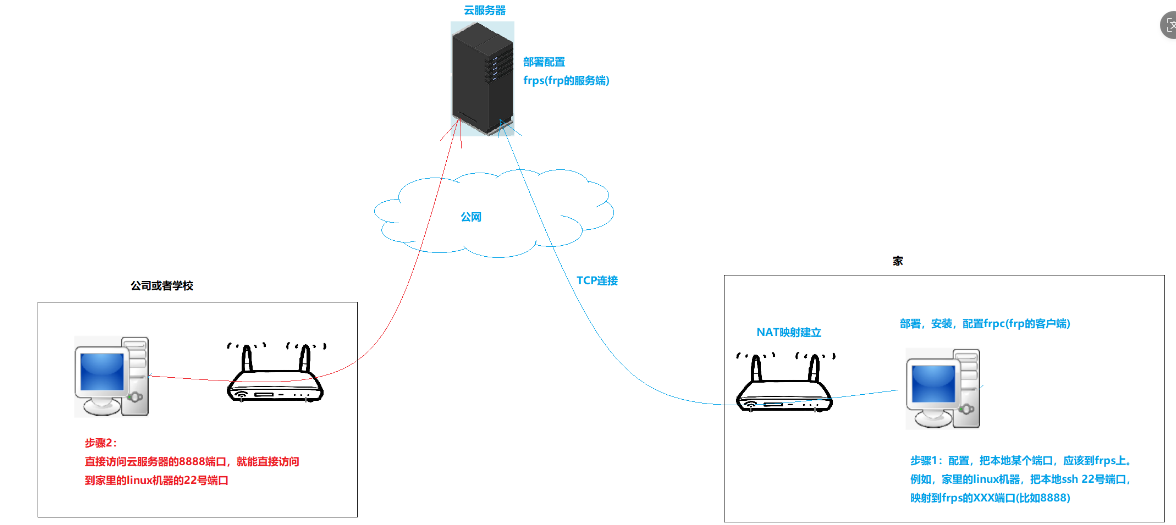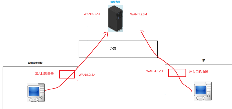 有两台主机A和B,他们分别在自己不同的局域网里,当双方要通信时,需要借助出入口路由器访问公网,假设主机A的出入口路由器的WAN口:1.2.3.4,经过公网,连接上云服务器,经过公网到达主机B的出入口路由器,假设主机B的WAN口:4.3.2.1,经过路由器转发到达主机B,这个过程中,云服务器可以保存下两个路由器的WAN口,之后把双方的WAN口交换,之后发送给对方的路由器,之后双方就可以在不同网络的内网设备间的直接通信