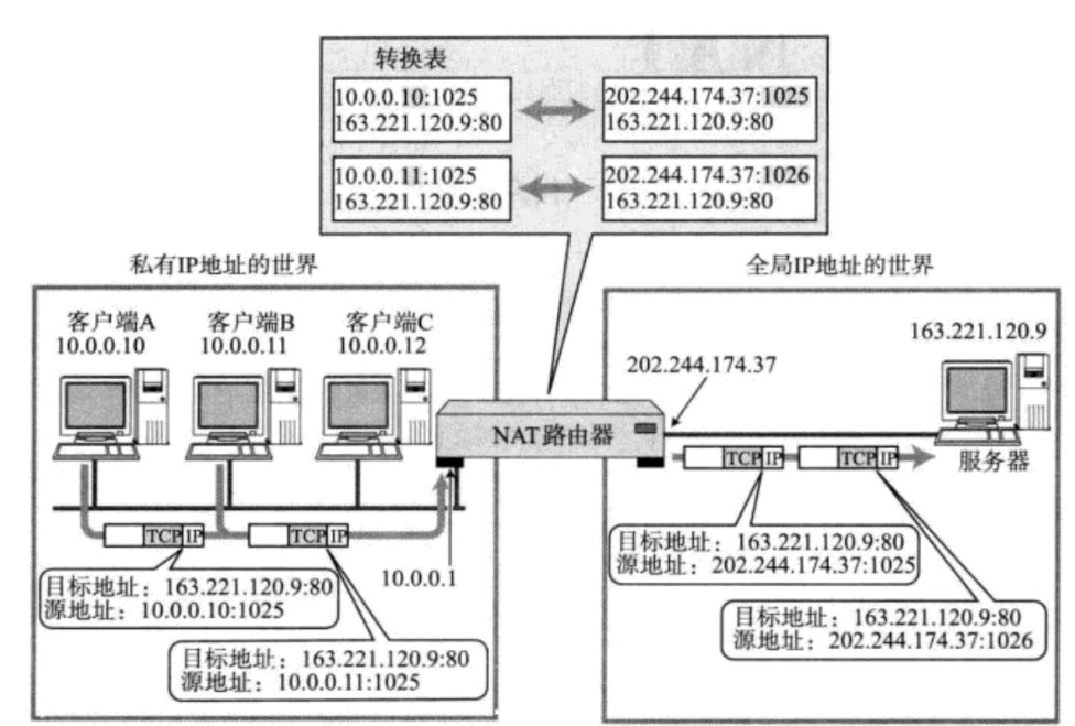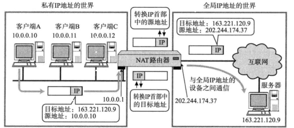 NAT路由器收到外部的数据时, ⼜会把⽬标IP从202.244.174.37替换回10.0.0.10;