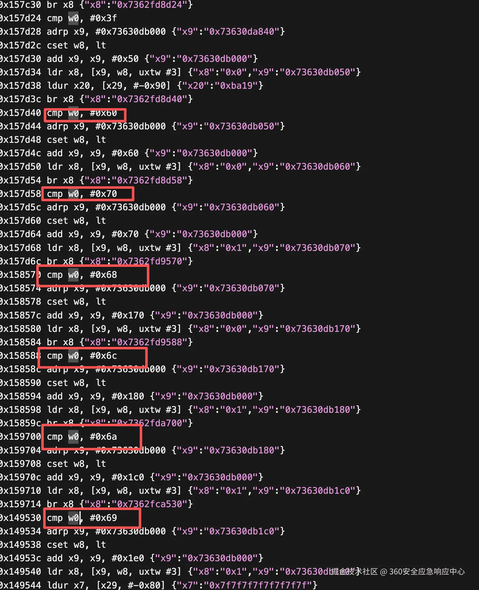 通过trace的log分析后,发现以下代码块出现了58次正好结合58条指令,猜测并标记地址为取指令行为