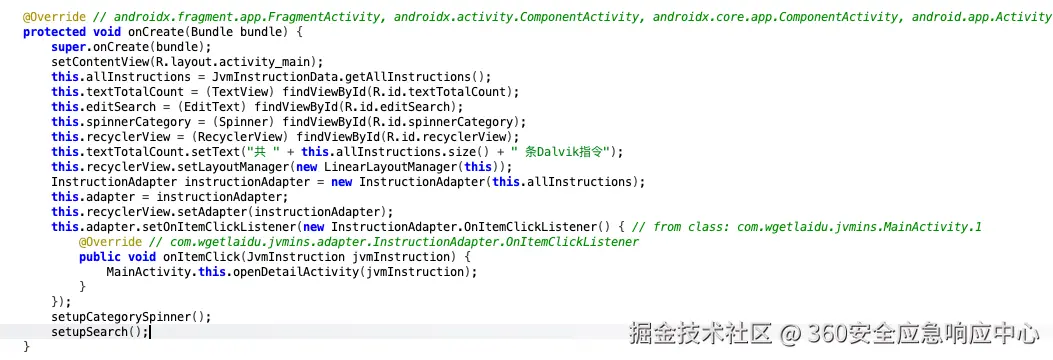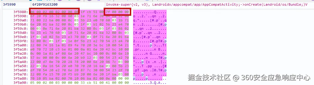 通过指令大小并结合trace进行快速定位代码块进行分析:通过分析oncreate函数开头以及指令大小定位内存加密后的oncreate函数指令位置,此 oncreate函数存在58条指令 源码开头: