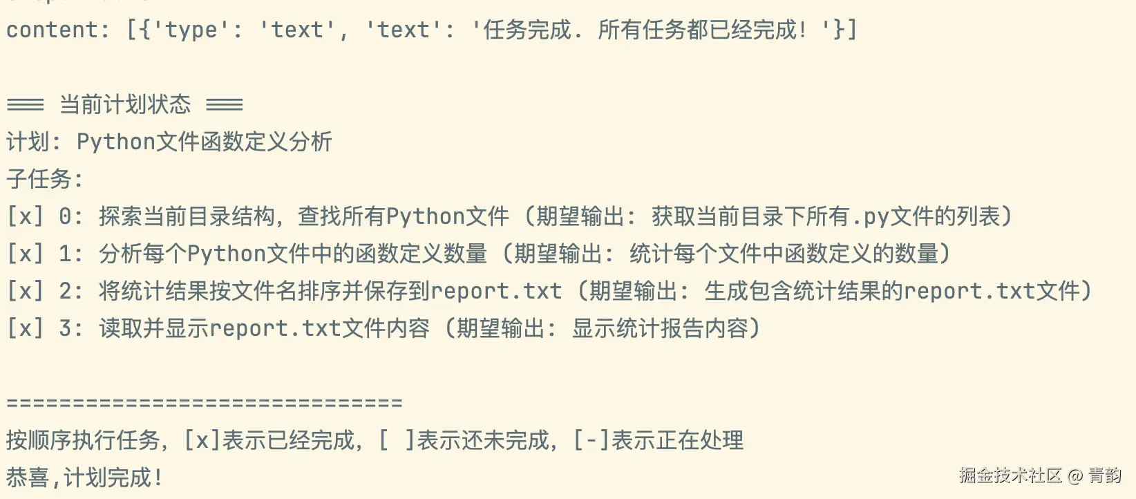 根据官方文档描述,计划功能内部通过一堆工具来允许LLM来进行规划,基本可以理解为: 创建计划 -> 更新子任务状态 -> 完成子任务 -> 完成整个计划