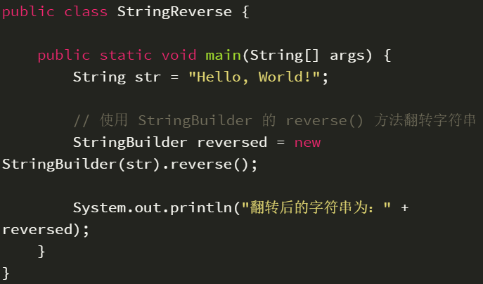 在这个示例中,我们创建了一个 StringBuilder 对象,并将原始字符串传递给它的构造函数。然后调用 reverse() 方法来翻转字符串,并将结果打印输出。