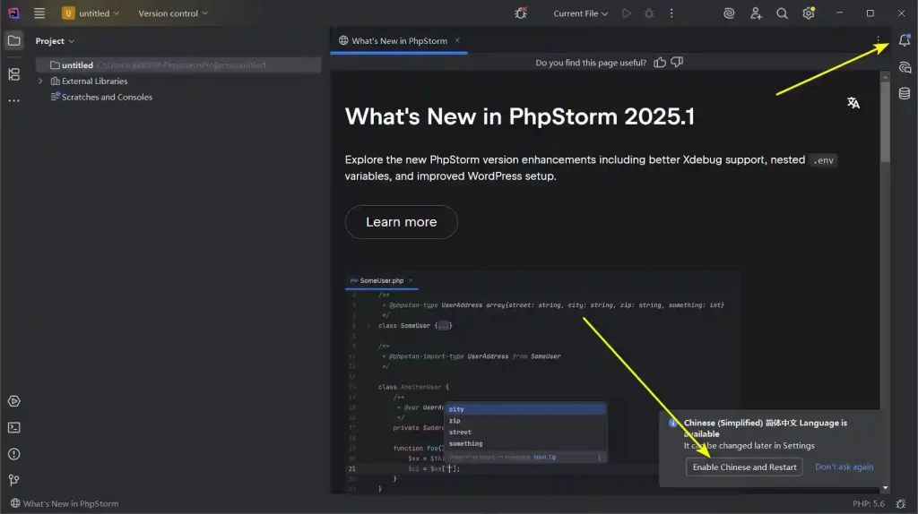 21点击Enable Chinese and Restart或者点击右上角小铃铛也是一样的步骤
