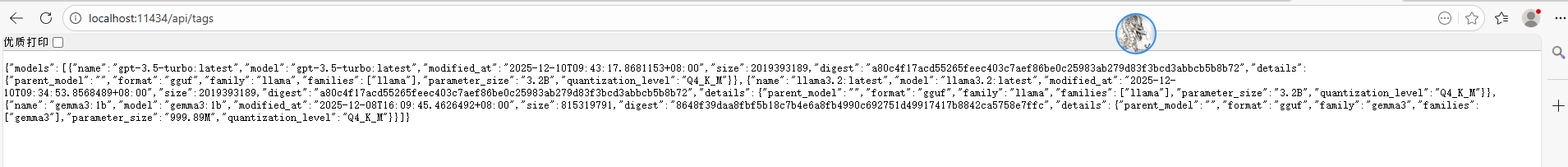 接下来浏览器输入检测服务地址 :localhost:11434/api/tags