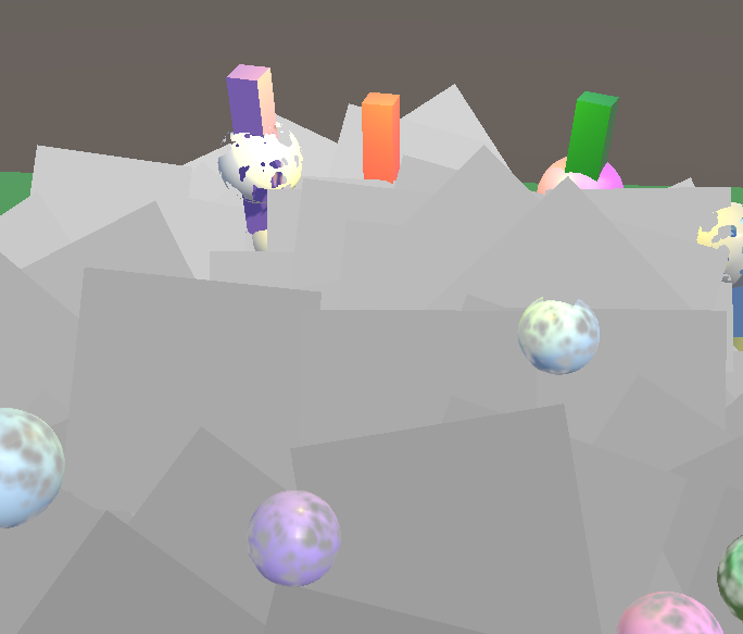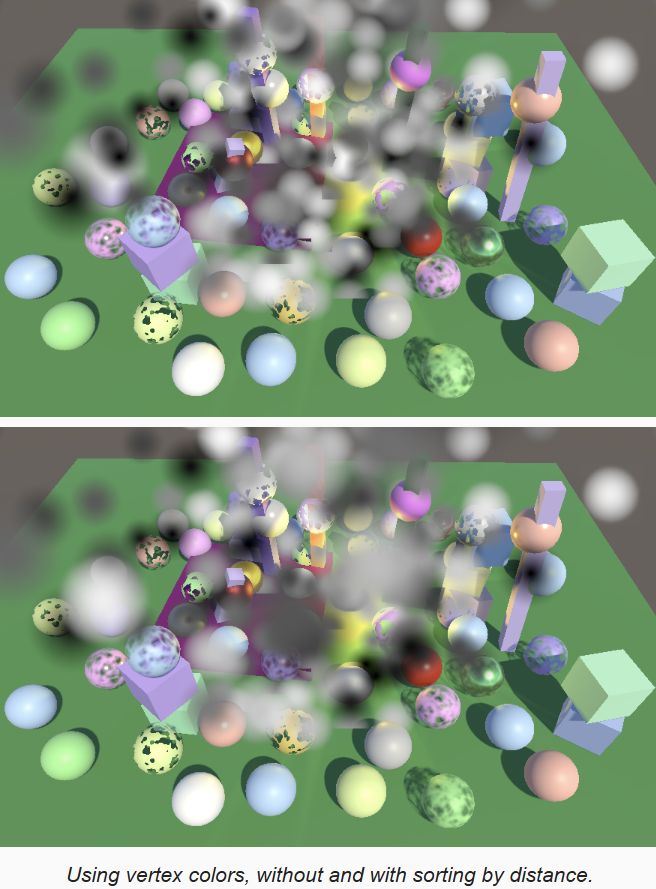 在粒子材质中开启 vertex color,可以看到每个粒子的颜色都不同了,但是现在粒子排序就有问题了。之前所有粒子颜色都是一样的,因此看不太出来,现在颜色不同,就需要根据距离进行排序,才能得到正确的结果。值得注意的是,当摄像机位置发生变化时,基于距离的排序会出现顺序突然改变的现象,其它半透明物体的渲染也有同样问题。