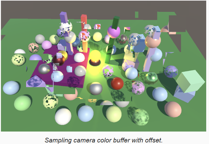 接下来,我们添加对粒子扰动的支持,用来模拟被加热的大气折射现象。这需要采样颜色缓冲区,就像采样深度一样,不过要用对UV进行偏移(扰动)。