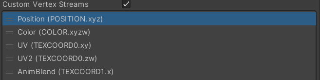 可以看到粒子的帧动画的帧率很低,能够很容易的看出动画帧(类似卡顿),如果粒子的声明周期是5秒,那么帧率就只有3.2帧/秒。可以通过混合相邻帧来进行平滑,这需要我们向 shader 传递第二组 UV 坐标,以及混合参数。通过在粒子系统的 Renderer 模块中启用 custom vertex stream 来实现,增加 UV2 和 AnimBlend,同时移除不需要的 normal。