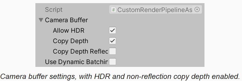 首先向 CameraBufferSettings 中添加拷贝颜色缓冲区的两个开关,一个用于正常渲染,一个用于反射渲染。