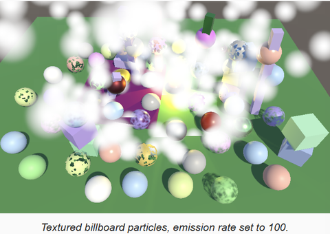 为材质应用该贴图,模式改为 Fade 后,粒子效果如下图。为了让效果更明显,把粒子发射率改为100