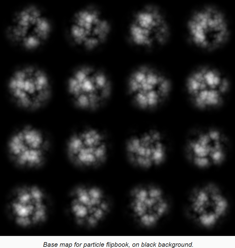 用上面的图,创建一个新的 unlit 材质,然后在场景中已有的粒子系统复制一个,使用新的材质进行渲染。启用粒子系统的 Texture Sheet Animation 模块,配置为 4x4 flipbook,让其从随机帧开始,基于粒子的生命周期播放一个循环。