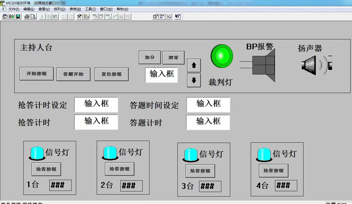 在 MCGS 中设计一个直观的抢答器界面,包含四个抢答指示灯、一个复位按钮和一个显示抢答结果的文本框。