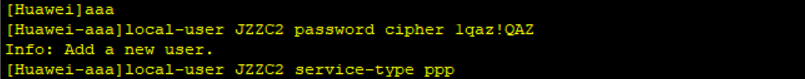 local-user JZZC2 password cipher 1qaz!QAZ # 配置一个名为JZZC2,密码为1qaz!QAZ的账户