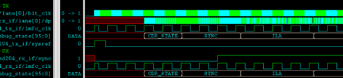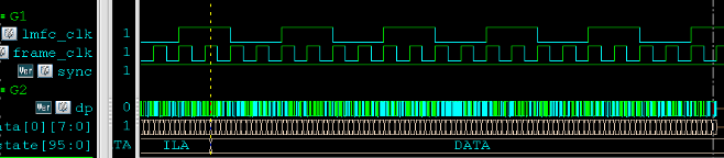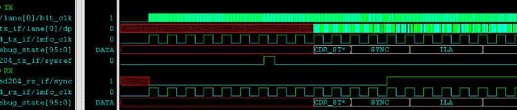 • b处,经过一定延时,tb中生成sysreg时钟,RX会在采到的第1次LMFC周期将SYNC拉高,然后TX开始发送ILA序列,然后继续传输