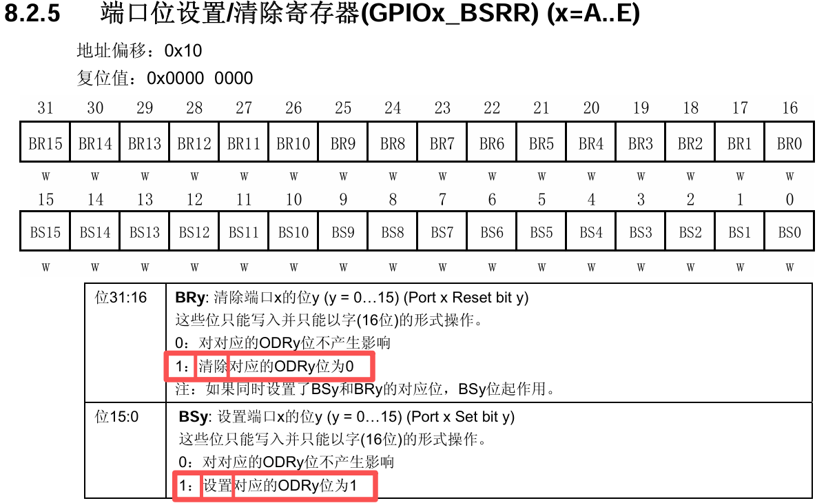 ✅同样的套路,先看《STM32F10xxx参考手册》的2.3章节找基地址,接着根据地址偏移量0x10找到具体的寄存器,从手册中可以发现,要置位或清零,直接往对应的引脚位写1即可