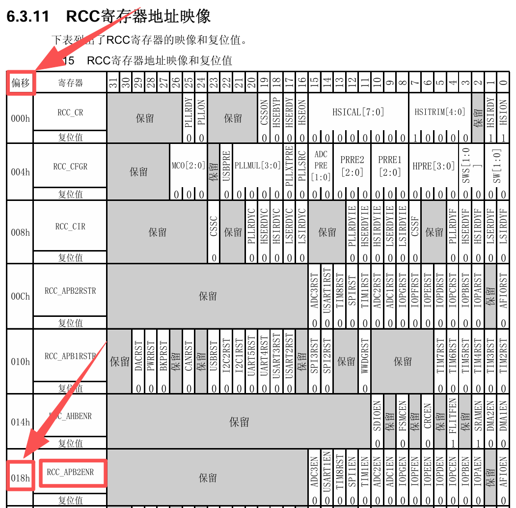 ✅通过查询《STM32F10xxx参考手册》的6.3.11 RCC寄存器地址映像章节得知