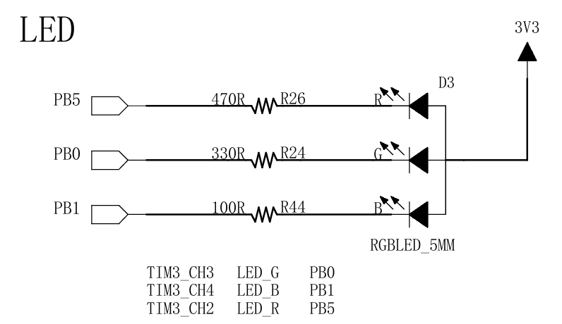 ✅电路原理图如下,我们只要让GPIOB的PIN1,推挽输出模式,输出低电平,即可让LED_B蓝色亮起来