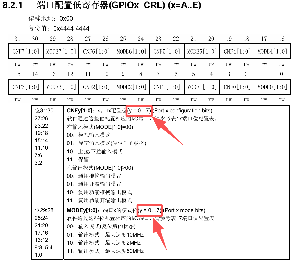 寄存器GPIOx_CRL,负责配置GPIOx的第0-7个引脚,对应手册中y = 0-7,每个引脚占用4位的寄存器。