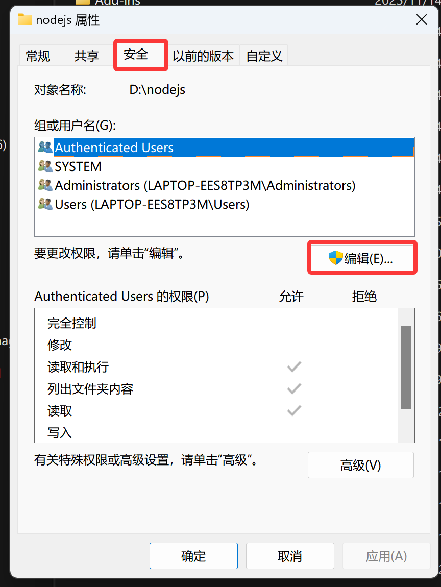 2.如果在d盘安装,d盘权限不够的话,需要在d盘新建nodejs文件,并且右键---》属性----》安全---》编辑---》完全控制