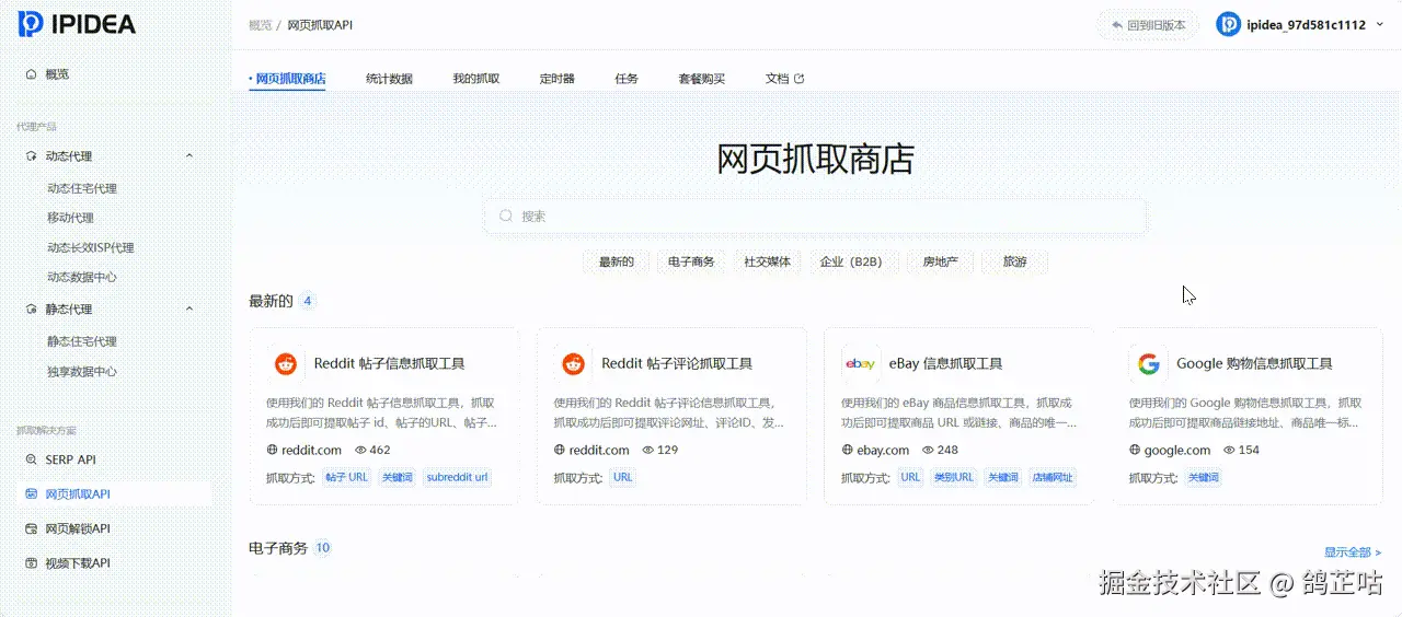 除了基础代理服务, IPIDEA 还推出了一系列高效的网页抓取解决方案,能够应对多种复杂采集场景,以下为其核心产品的实测表现