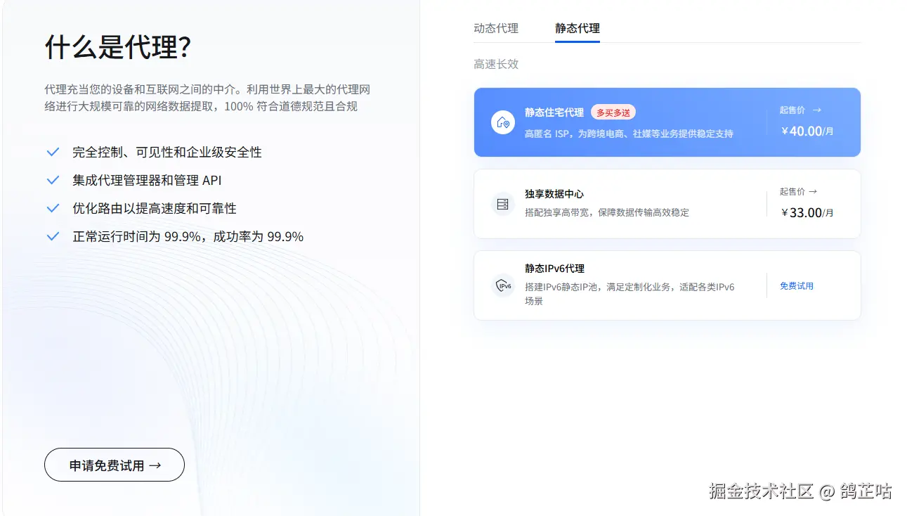 | 静态 (Static) | IP地址长期固定,可长达数月甚至更久不变。 | 维持网站会话与信任体系,适合长期监测任务。 |