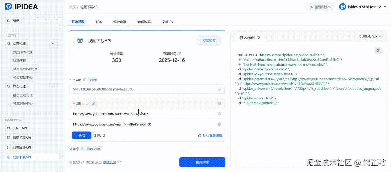 针对视频内容采集需求,提供了专门的视频数据集下载接口,适用于 AI 训练、内容分析等场景,支持批量获取与格式转换。以下是数据集下载实测展示