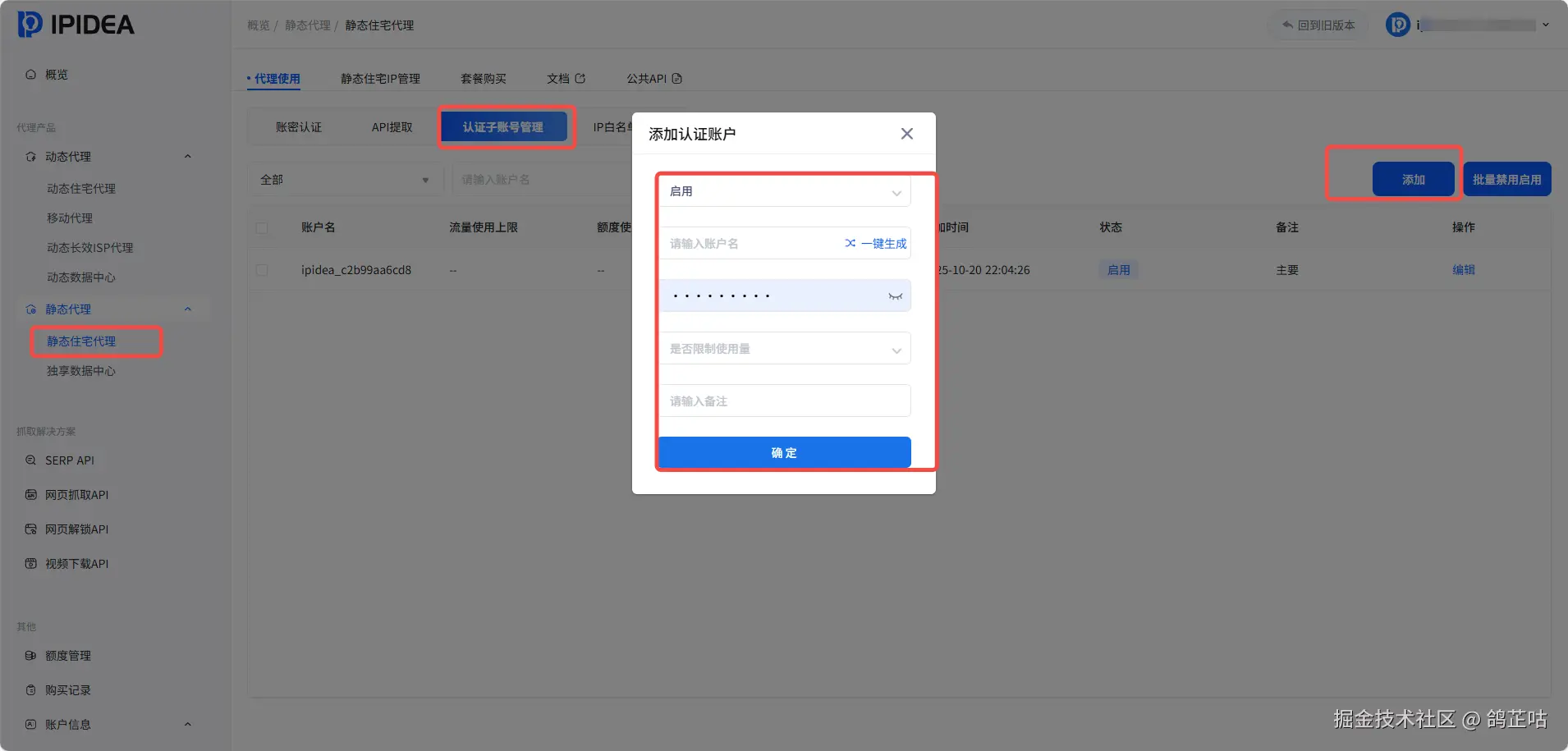 静态住宅代理通常采用"账密认证"模式,配置格式固定。