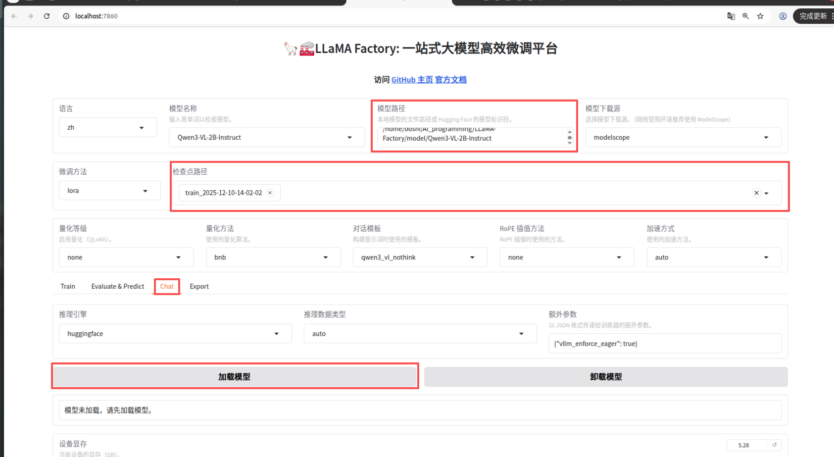 点击chat、选择训练好模型路径、点击加载模型、进行问答