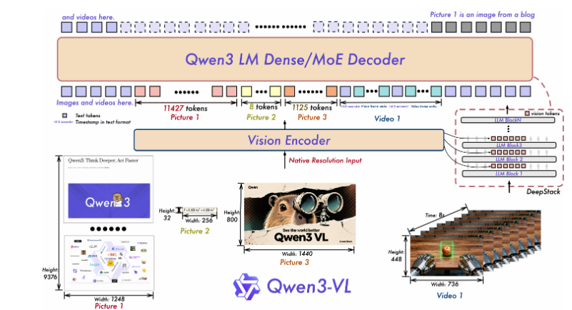 一是采用 MRoPE-Interleave ,原始MRoPE将特征维度按照时间(t)、高度(h)和宽度(w)的顺序分块划分,使得时间信息全部分布在高频维度上。在 Qwen3-VL 中采取了 t,h,w 交错分布的形式,实现对时间,高度和宽度的全频率覆盖,这样更加鲁棒的位置编码能够保证模型在图片理解能力相当的情况下,提升对长视频的理解能力;