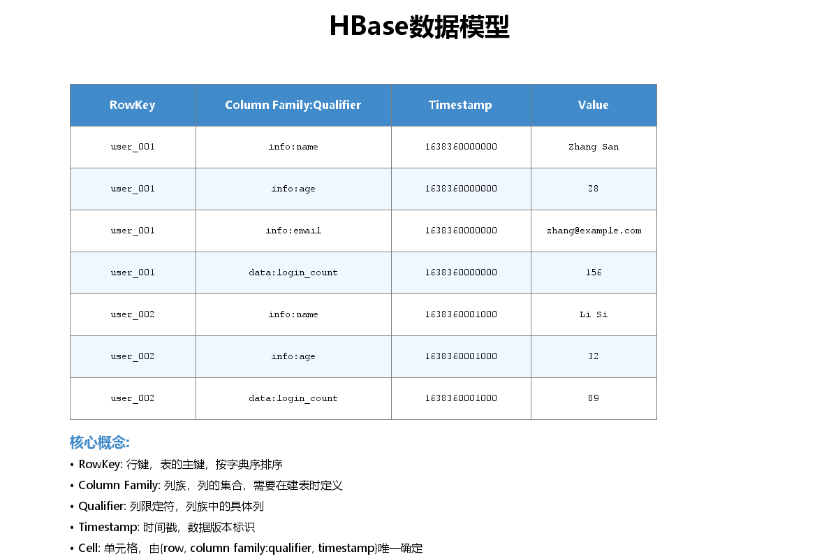 - Cell(单元格):由{row, column, version}唯一确定的值