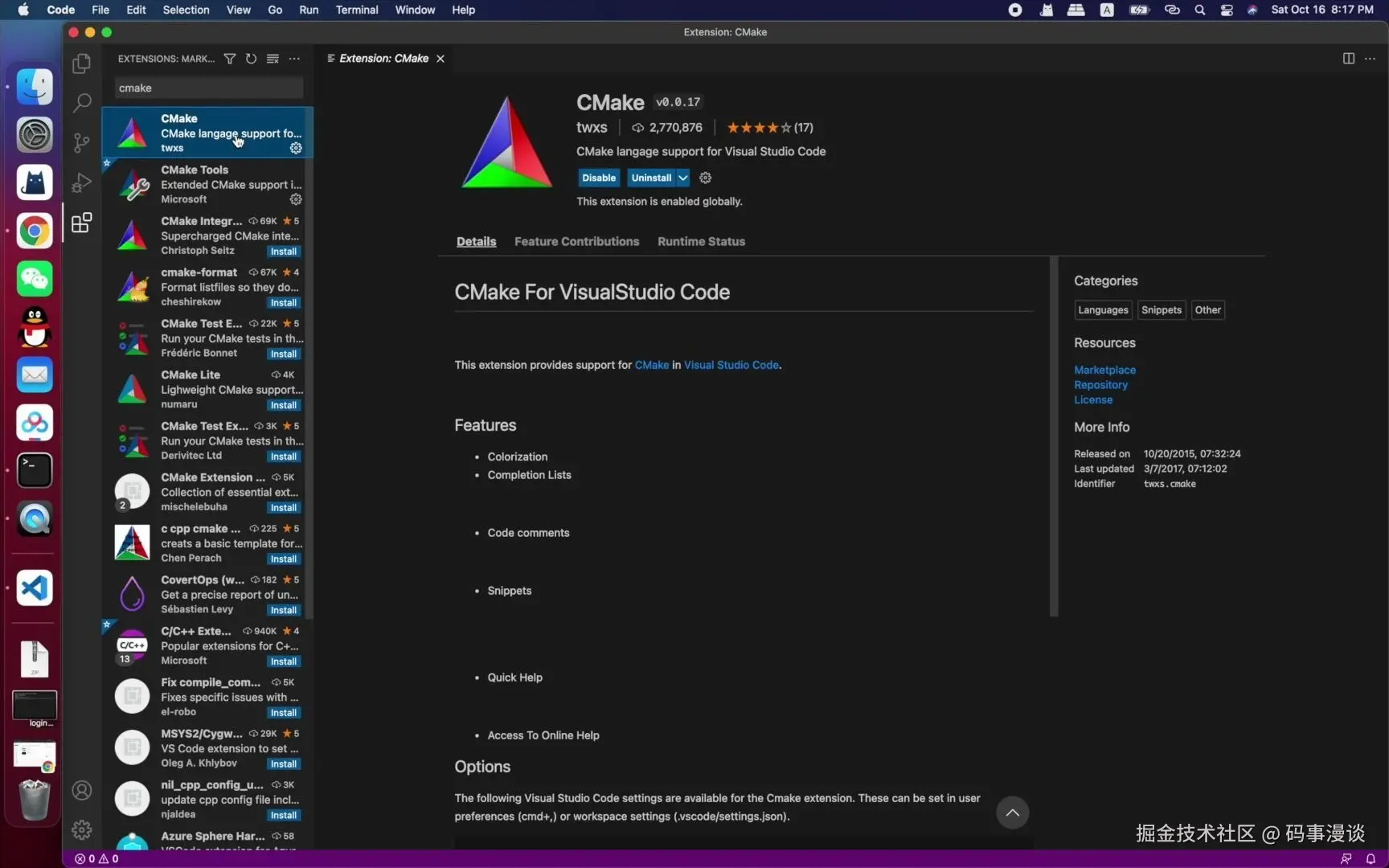 获取该工具的标准流程需通过 VS Code 扩展面板完成。在扩展市场搜索 "cmake" 时,需注意选择 Microsoft 官方发布的 "CMake Tools"(描述为 "Extended CMake support..."),点击界面中的 "Install" 按钮即可完成安装。