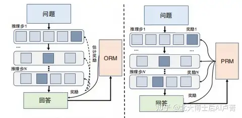 中,ORM 通过评估模型输出的最终结果来提供反馈,这个奖励值表明了输出是否符合预期