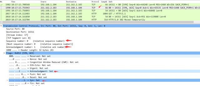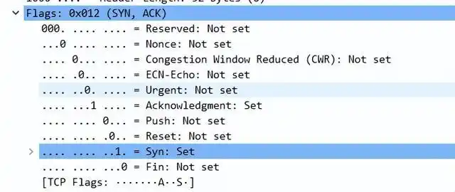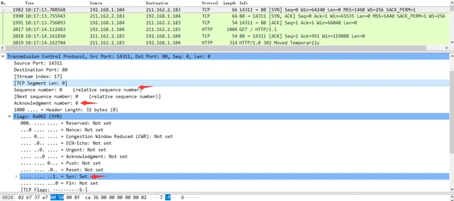 服务器发回确认包, 标志位为 SYN,ACK 将确认序号(Acknowledgement Number)设置为客户的ISN加1,即0+1=1, 如下图