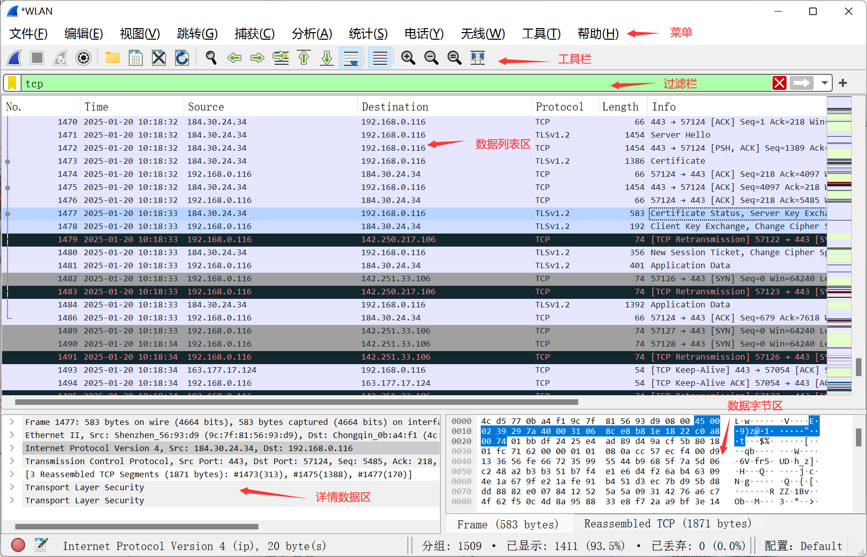 Wireshark 的主界面包含6个部分: