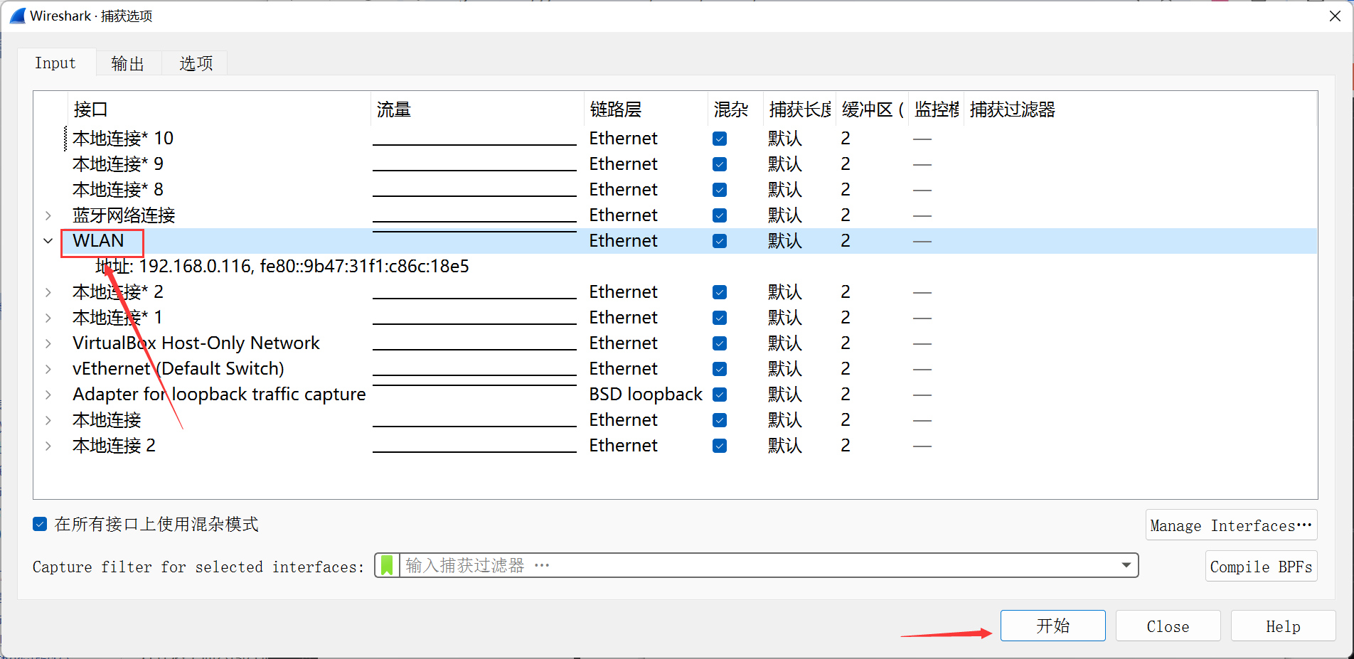 - 在弹出的捕获选项界面,最下方的输入框中输入过滤语句,点击开始即可抓包。