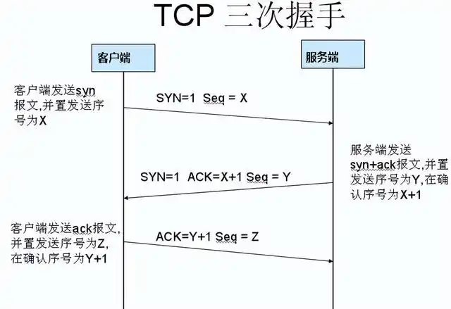 | 第三次握手:客户端收到服务器的SYN+ACK包,向服务器发送确认包ACK(`ack=y+1`),此包发送完毕,客户端和服务器进入`ESTABLISHED`状态,完成三次握手。 |