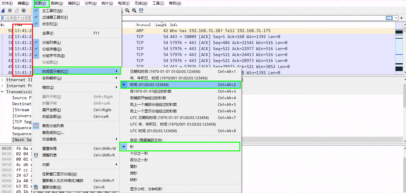 数据包列表栏的时间这一列,默认显示格式看起来很不方便,我们可以调整时间的显示格式。