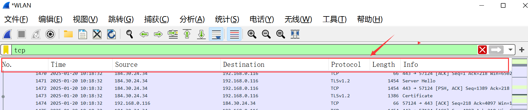 数据包列表是最常用的模块之一,列表中有一些默认显示的列,我们可以添加、删除、修改显示的列。
