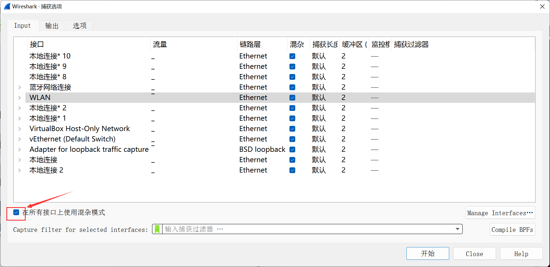 勾选 在所有接口上使用混杂模式。